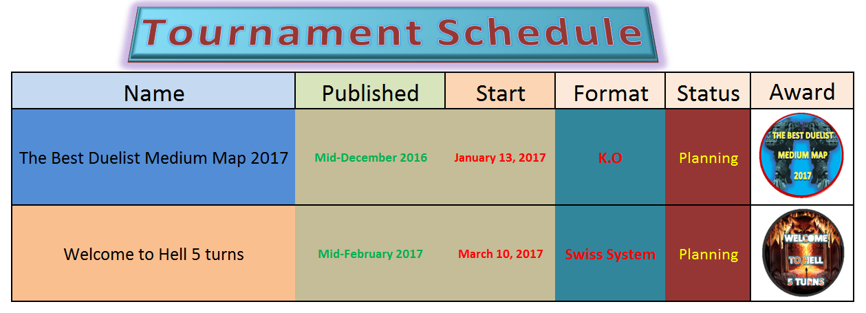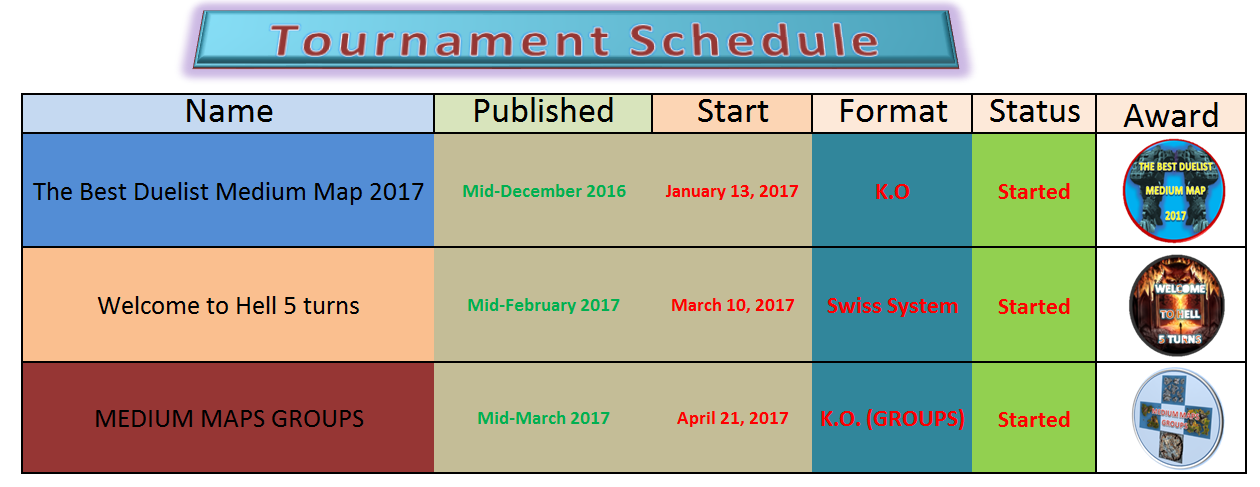For create a tournament you can try be creative with format but it is not easy if you use maps or settings that community don't play usually. Simply take a look to the list of players of the last tournaments. We have a number of tournament's players around of 30-40 depending of format and time for play. It is work enough for manage it for a small number of players, but in my case I always thinked that tournaments give an extra interest to our wonderful game. I don't mind working for others to enjoy it.