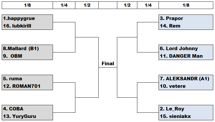 Пока это все. Турнир стартовал вчера. Двое лучших из каждой группы (2х5 =10 игроков) присоединятся к 6 лучшим по турнирному рейтингу и начнут плэй-офф. Карты и время начала озвучу позже. Спасибо.